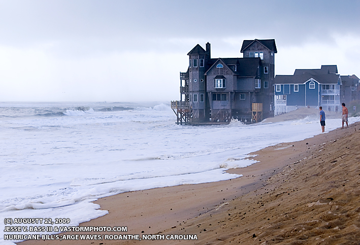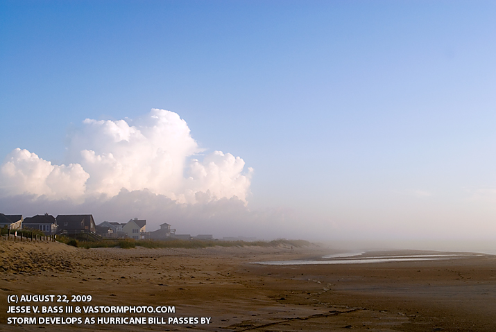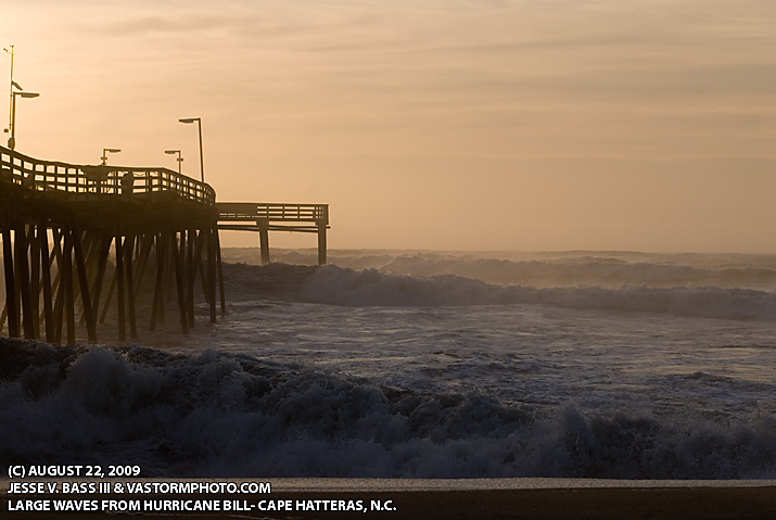 HURRICANE BILL PASSES THE OUTER BANKS, N.C. August 22, 2009 Major hurricane Bill pushed huge waves out ahead of him as he churned his way westward in the Atlantic. Those large waves would make their way to the North Carolina coast and I traveled to the Outer Banks to shoot them. As they moved in, there was some over wash in areas along Hwy. 12 but nothing to bad. Through the day storms would pop up over the Outer Banks and drop some heavy rain at times, nothing to do with Bill's passage. Later on the way home a cold front was approaching the area and I saw a large shelf cloud from a thunderstorm making its way eastward. So, I pulled over and waited for it to move over. Below are photos from the day on the Outer Banks and the thunderstorms on the way home. From the Rodanthe fishing pier in the Outer Banks, large waves from Bill move in and batter the pier.