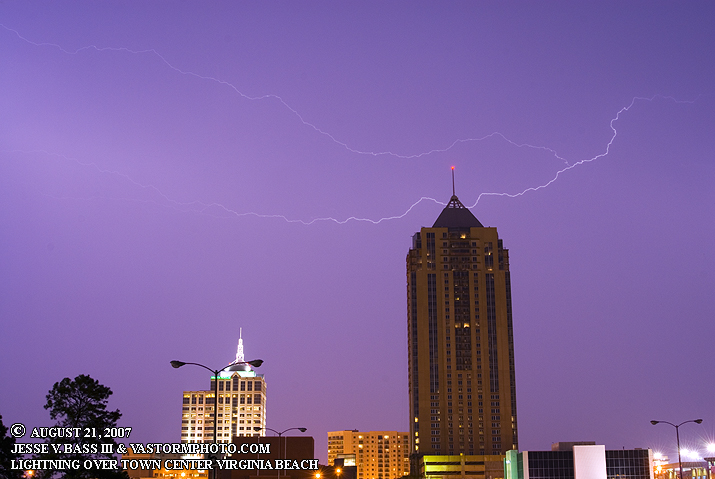 SEVERE STORMS IN HAMPTON ROADS, LOTS OF LIGHTNING! August 21, 2007 A hot and humid day in Hampton Roads gave way to severe storms moving westward early in the evening and into the night. As the storms approached from the west in Suffolk, I drove to the Portsmouth campus of T.C.C. where the wind came off the James River gusting to 37mph but sustained winds in the upper 20's to mid 30'smph. As the storms moved in I decided that I needed to move somewhere else as there was not much structure to get under to protect me from the rain and wind. The storms were moving westward near 30mph and before I could get onto I-664, one cell had slammed the interstate with heavy rains and an approaching core with constant lightning. As I drove into Bower's Hill lightning flew overhead several times and hit transformers to my left in Portsmouth causing an eerie green flash each time. I believe there were about 3 or 4 that were hit in about 5 minutes. I continued to drive eastward through the downtown tunnel and drove to meet Bill Coyle at the Virginia Beach Town Center. We set up as the storms pushed overhead hopping to catch the Town Center getting struck. Well, for some reason ,it never happened. Lightning flew and danced overhead but missed the tower atop the Town Center. We still walked away with some great shots. Below are the photos and a link to the video taken from Suffolk to Virginia Beach. SEVERE STORM VIDEO CLIP: Video still to come