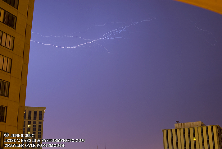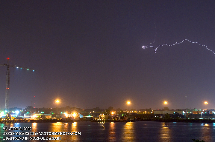 LATE NIGHT STORMS IN HAMPTON ROADS! LOTS OF LIGHTNING! June 5 and 8, 2007 Last week proved to be a turning point in the weather for southeast Virginia. After Tropical Storm Barry moved through, it seems that we have returned to a wet and stormy period at least in the short term. On June 5th late night storms moved in from the west between midnight and 2am. Some of the storms were severe warned as the winds were gusting to near 60mph with tree limbs coming down and power out all across the area. I went down to downtown Portsmouth just after the storms moved through my area to shoot from the parking garage I have taken many lightning photos from in the past. It was difficult to see as the lightning was embedded in the heavy rains that were falling. We picked up a little over an inch in about twenty minutes. There are four photos below from that evening. One June 8th, the temps across the area had reached the mid and upper 90's with an approaching cool front from the west and northwest. By about 11pm or so, a line of storms developed near the Richmond area moving southeast towards Hampton Roads. The storms gusted out before reaching the area, however, a new line formed along that outflow boundary and pushed into Hampton Roads with several storms becoming severe in Chesapeake and Suffolk before moving into North Carolina. STORM VIDEO CLIP: Still to come June 5, 2007: